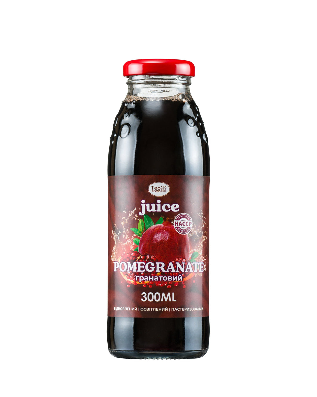 Сік відновлений гранатовий. Склад: сік гранатовий концентрований, вода питна, цукор, глюкозний сироп, регулятор кислотності лимонна кислота Е330, цитрат кальцію Е333, консервант: сорбат калію Е202. Харчова та енергетична цінність на 100 g (г) продукту: білки 0,09 g (г), жири 0 g (г), вуглеводи 19,45 g (г), 74,0 kcal (ккал), 309,9 kJ (кДж). Зберігати при температурі від 0°С до +25°С та відносній вологості не більше 70%. Відкриту пляшку слід зберігати в холодильнику не більше 24 годин при температурі від +2°С до +6°С. Термін придатності 12 місяців з дати виробництва.