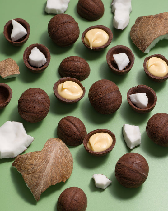 Склад: тісто - коричневе пшеничне, масло вершкове (82,5%), яйце куряче, цукор, какао порошок, розпушувач, сіль. Начинка - шоколад белый, вершки 30%, кокосовая стружка, кокосовое масло, цукровий.Звичайна ціна 380.00 грн -