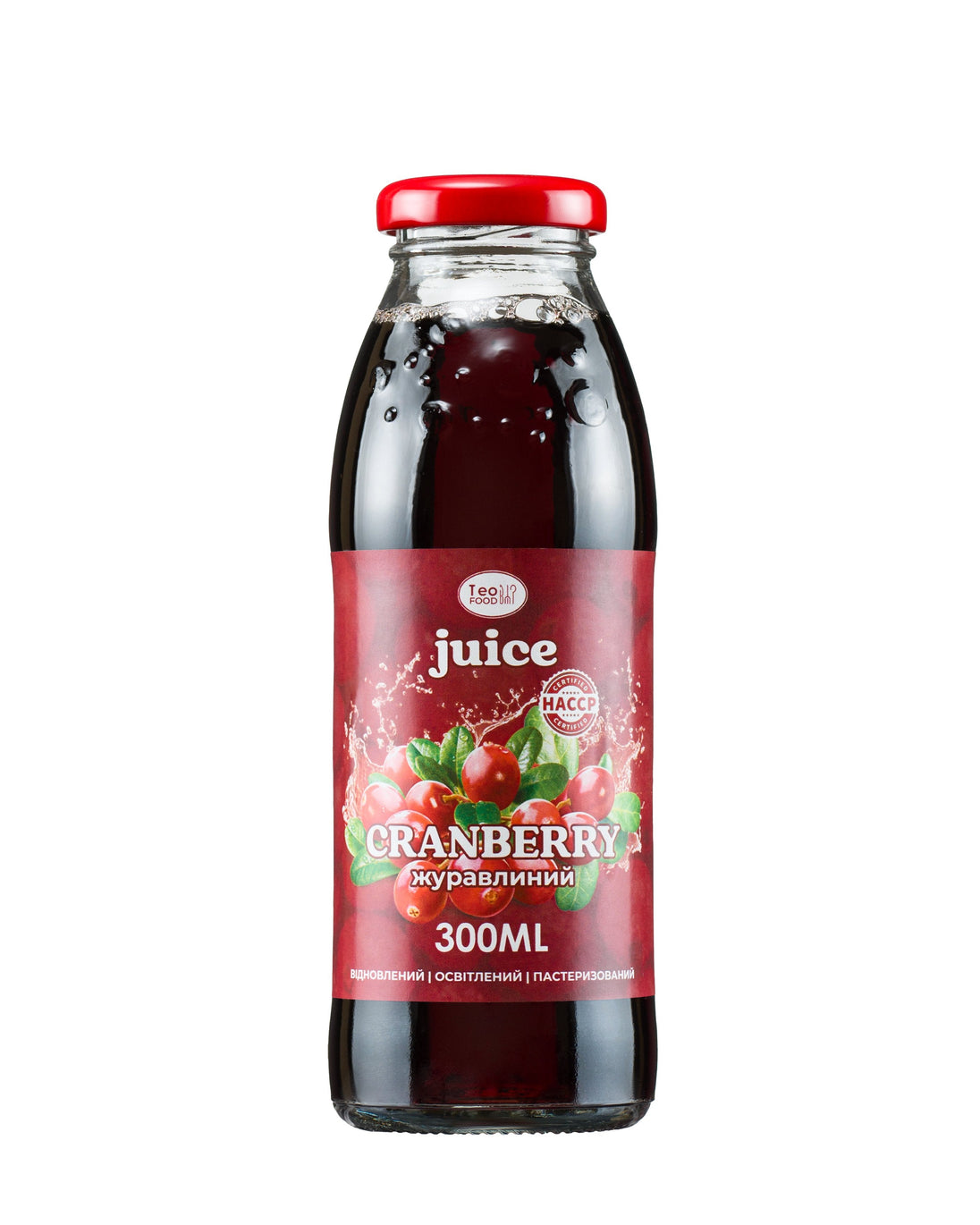 Сік відновлений журавлини. Склад: сік журавлини концентрований, вода питна, цукор, глюкозний сироп, регулятор кислотності лимонна кислота Е330, цитрат кальцію Е333, консервант: сорбат калію Е202. Харчова та енергетична цінність на100 g (г) продукту: білки 0,045 g (г), жири 0,015 g (г), вуглеводи 19,3 g (г), 73,6 kcal (ккал), 308,1 kJ (кДж). Зберігати при температурі від 0°С до +25°С та відносній вологості не більше 70%. Відкриту пляшку слід зберігати в холодильнику не більше 24 годин при температурі від +2°С до +6°С. Термін придатності 12 місяців з дати виробництва.